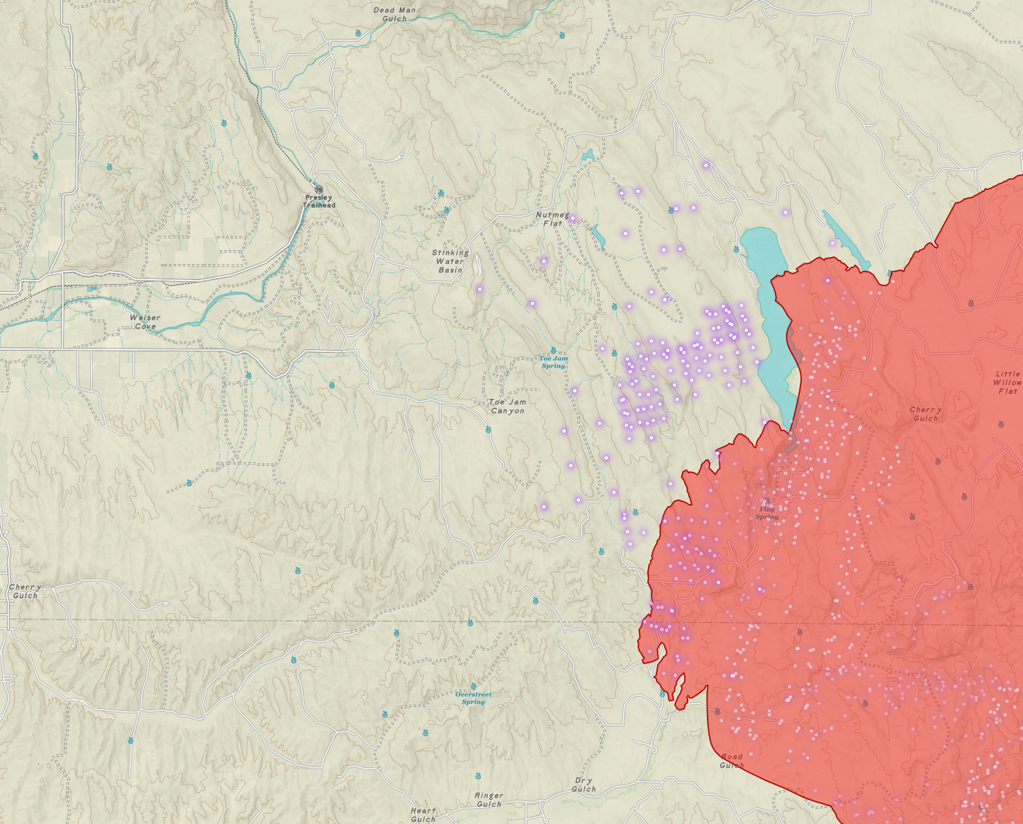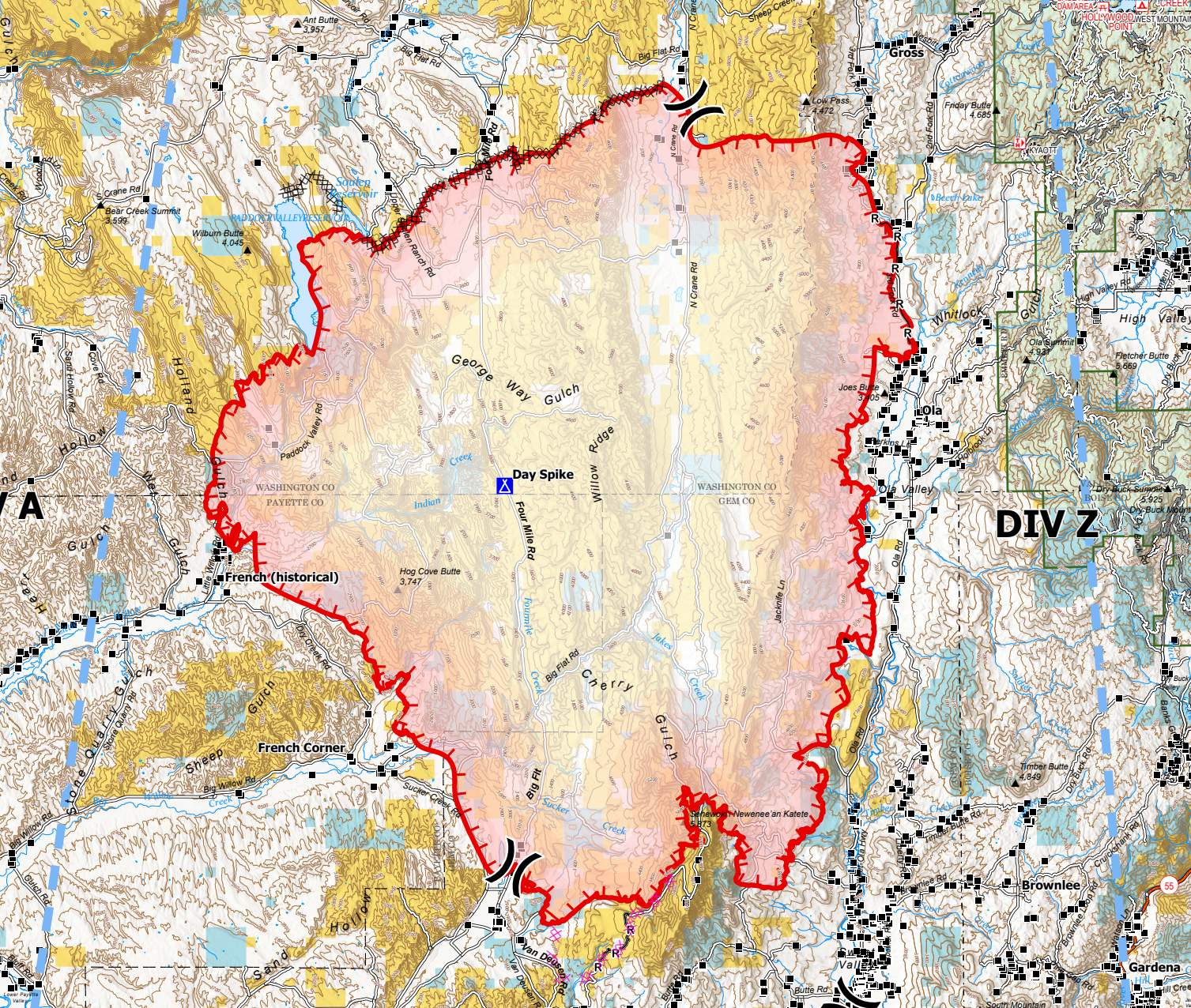 Swapping to one of my maps now, you can see the fire is growing west of Paddock Valley Reservoir today. Much of this afternoon's tanker work has been on this flank; it appears they're trying to hold South Crane, Skow, Sand Hollow, and a couple of other connecting roads to stop the fire prior to reaching the Weiser River. This will be done via a mix of tanker work, firing operations (aka burnouts or back burns), point protection, and strategic dozer work. I'm not on the ground there of course, so I can't say for certain, but I generally have a good feeling they'll hold their intended line given the situation and conditions as I understand them at the moment.