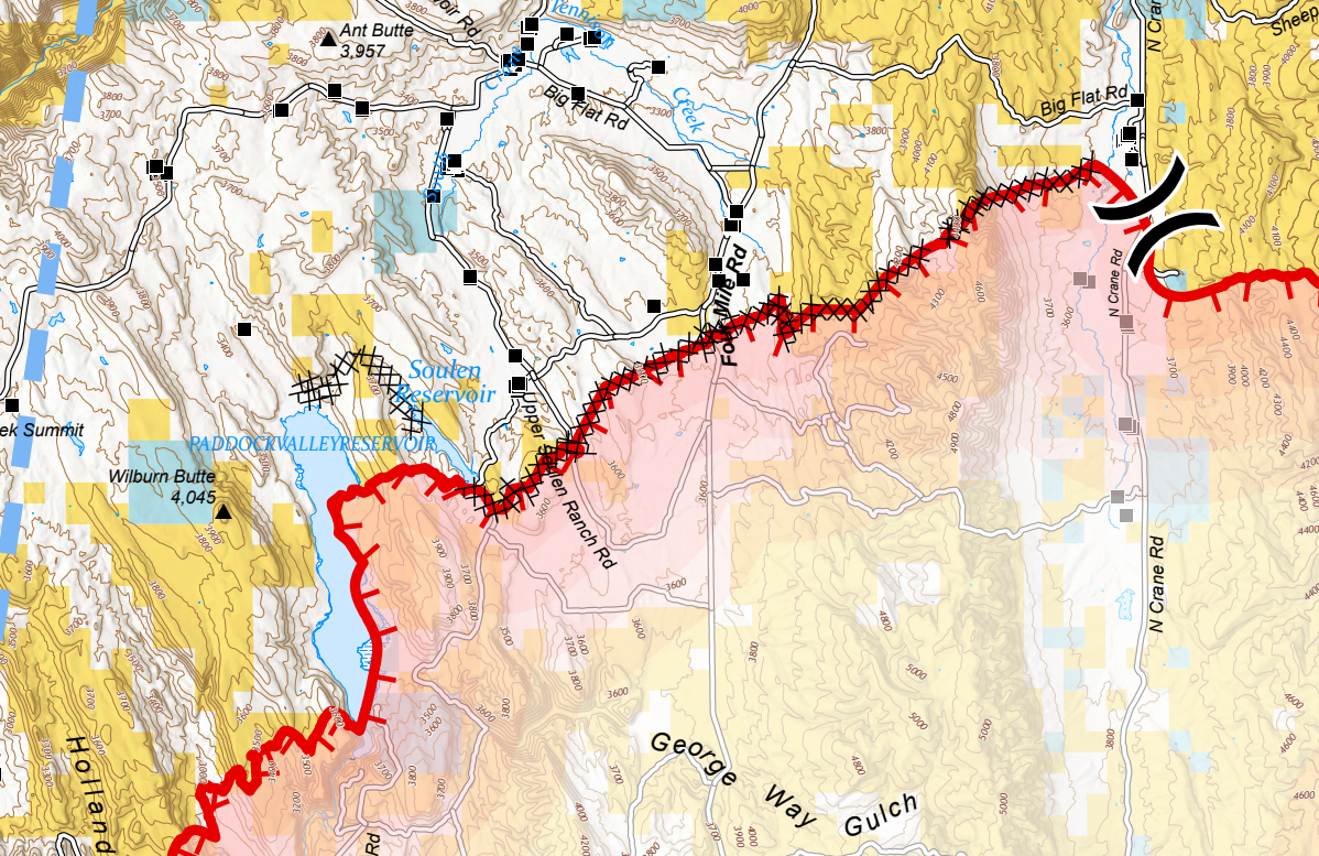 Moving north, there's a dozer line between N Crane Road and Paddock Valley Reservoir. You can see the fire here butts up against the dozer line, this area doesn't meet the containment definition yet, but it is extremely unlikely that we'll see northern progression across this line.