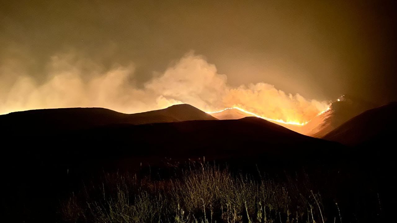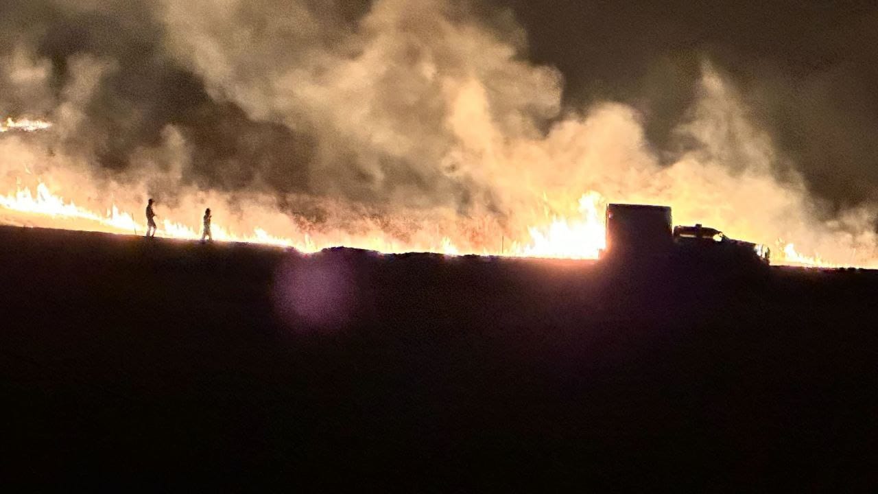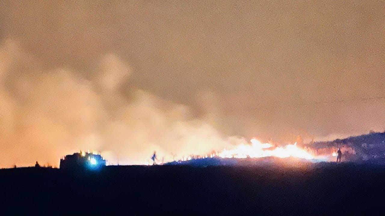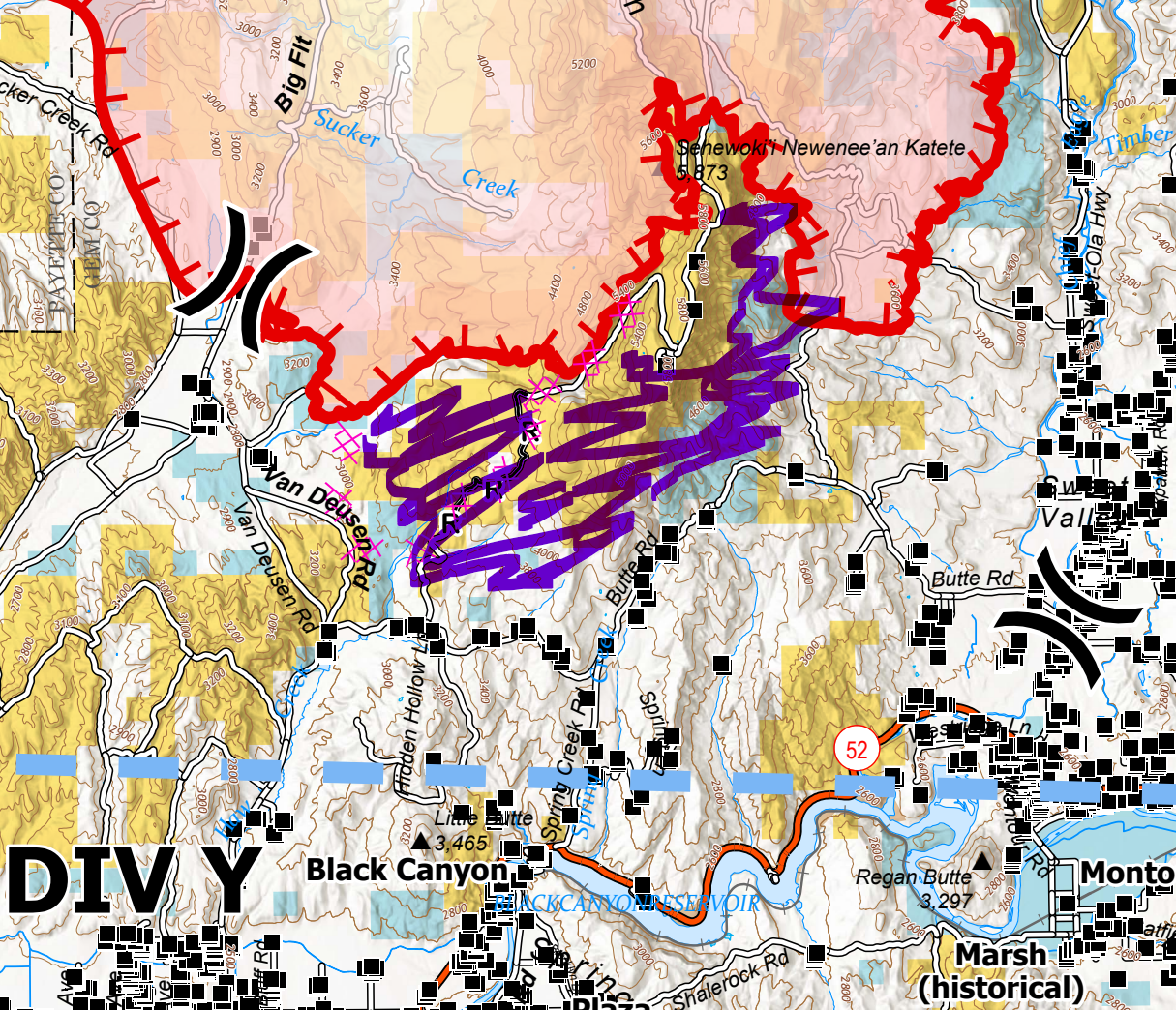 Alright, let's examine the South end of the fire around the Butte. I was up late in the evening/wee hours talking with one resident in the Butte area. I'll drop photos from her below. The fire came over the Butte and worked its way down toward Butte Road. Firefighters were doing nighttime dozer on the south end of the butte to ensure the fire couldn't work its way around the face and make a run up the valley. This ensured the fire would back down the butte, a much more manageable fire-fight. As the fire approached Butte Road, crews showed up with dozers, engines, drip torches, and flare guns to conduct a nighttime burnout along the road, creating a nice buffer of black. This operation stopped the fire and saved the ranches and homes along the road. That was just before dawn this morning, so it's not on any map yet, but from talking to people in the area, I believe the fire has been held at Butte Road, and I don't foresee any further growth to the south or southeast. You can see this area I'm talking about, beautifully colored by yours truly on the ops map below (area marked in purple).