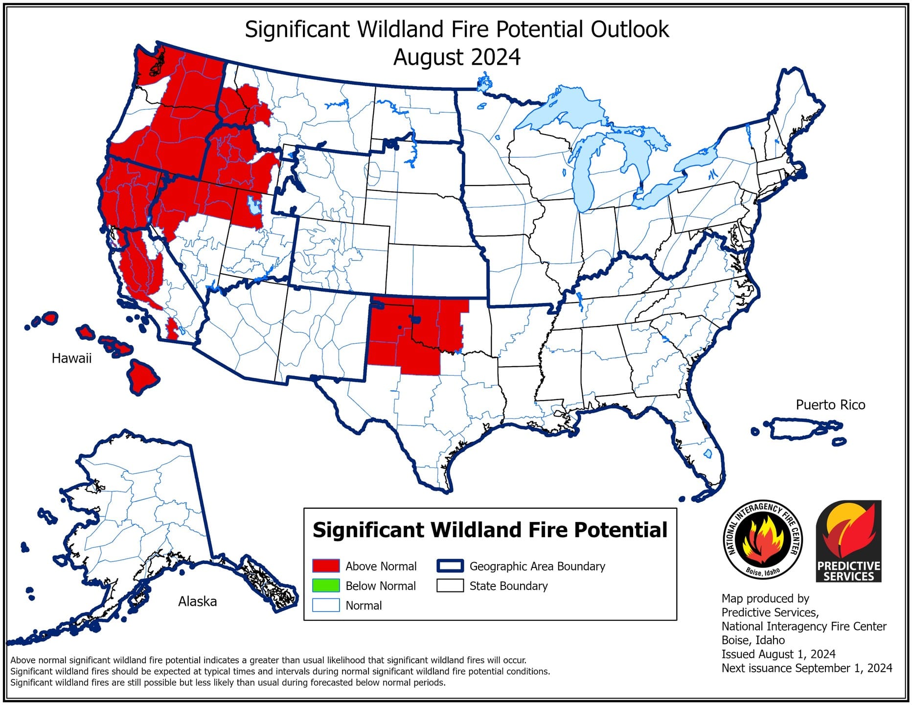 My point is that August is our worst month nationally (and certainly here in Idaho), and we're entering that worst period with resources already stretched insanely thin. NIFC released the Wildland Fire outlooks for August and September – the outlook for Idaho is "Above Normal" for August and September.