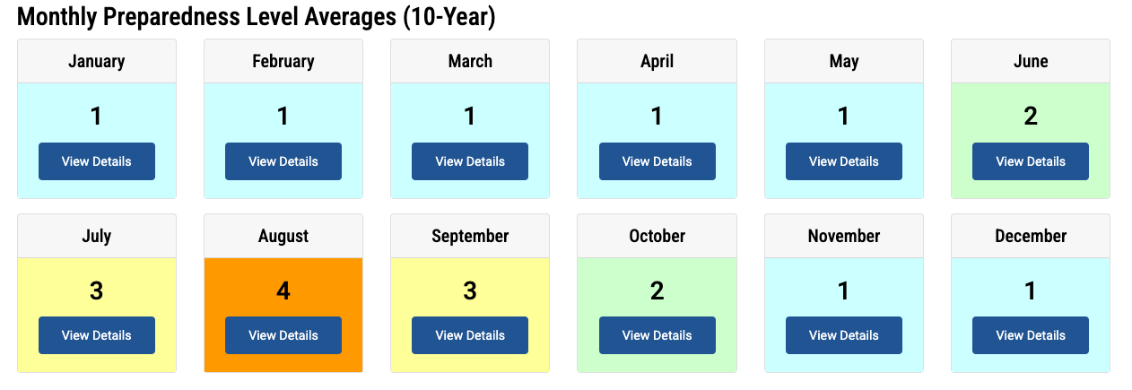 Welcome to August, folks. It is historically the peak of fire activity nationally, with an average national Preparedness Level of 4. The Preparedness Levels (PL) scale used by NIFC categorizes wildfire readiness and resource allocation from PL 1 to PL 5. PL 1 indicates minimal fire activity with available resources. As fire activity escalates, PL 2 and PL 3 reflect increased incidents and the need for more interagency coordination. PL 4 signals significant fire activity and resource strain, requiring national mobilization and prioritization. At PL 5, widespread fires have severely depleted resources, necessitating emergency measures and extensive national support to sustain operations. August is the only month that averages a PL of 4, but of course, we've been at PL 5 this year since mid-July, with only three other years reaching PL 5 before we did this year.