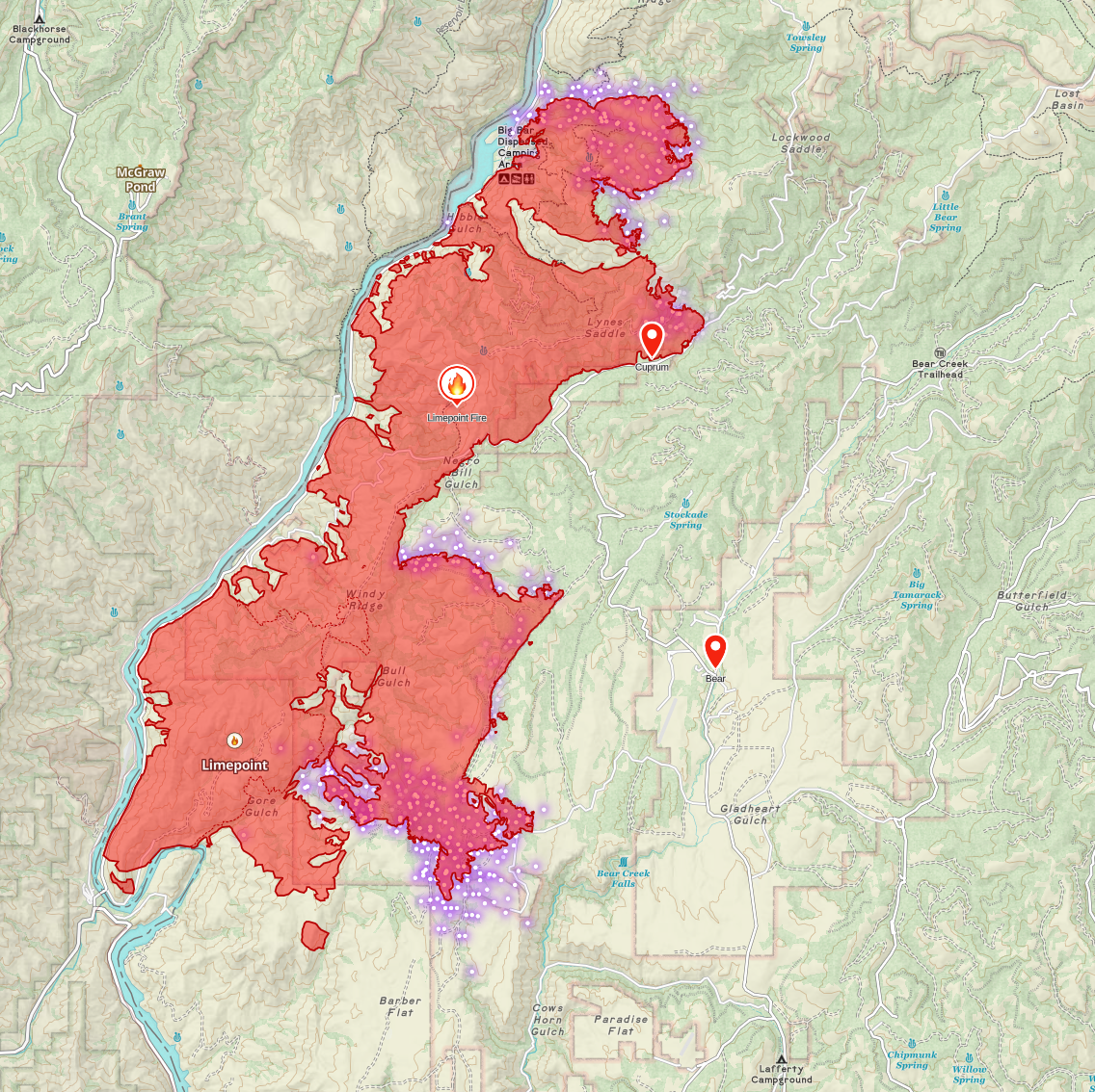 The good news is that, though firefighting is still taking place in and around Cuprum, I think we're pretty safe there at this point. I did hear rumors earlier that firefighters were being pulled out of Bear for their safety as the fire was approaching. Everything I see says those rumors are not true – I'm not seeing any verifiable reports, it's not reflected on the Ops map from 2 hours ago, nor am I seeing any heat signatures in the vicinity of Bear yet. I think this rumor came from the fact that they pulled a bunch of resources out of Bear and shifted them further south into Wildhorse, Barber Flat, and Paradise Flat areas, given the fire approaching them but that was possible since Bear is not in immediate danger.