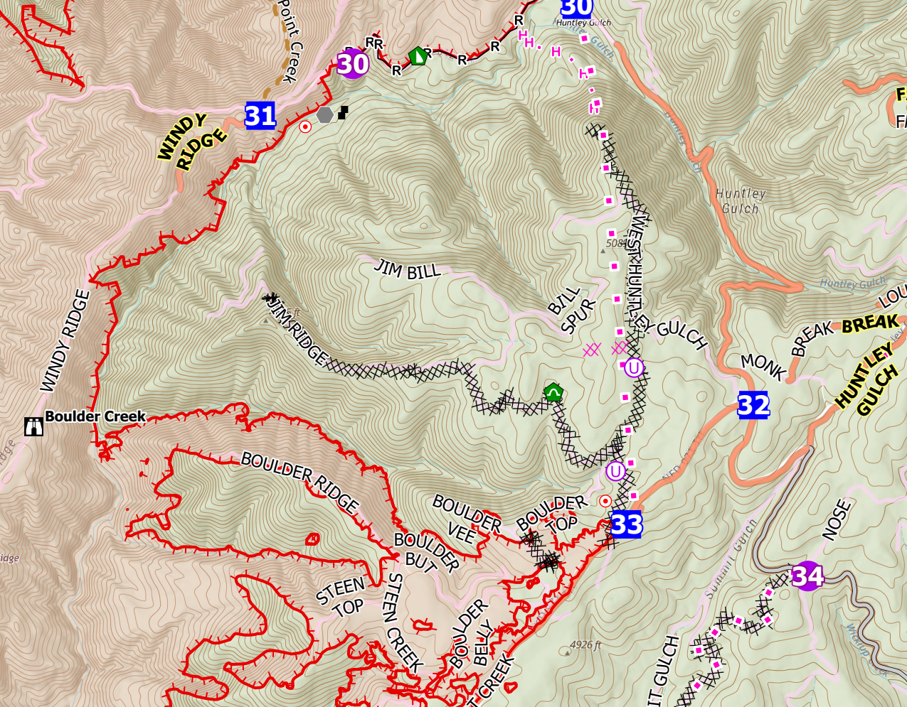 On this map, you'll see three areas of heat (the bright dots). The north end is burning north and hitting some nasty terrain – that's going to be a problem. The south end is burning south and favoring east; crews are trying to prevent it from getting established in the Wildhorse area, dropping into Cows Horn Gulch, and also trying to protect high-voltage power lines in the area. In the middle, the third area is where crews are trying to pin fire on a dozer line. There were some firing operations in the area last night to add some black to the lines to help stop the advancing fire. I don't see any heat signatures across the mapped dozer lines at the moment, so I'm hopeful this activity won't progress anywhere.