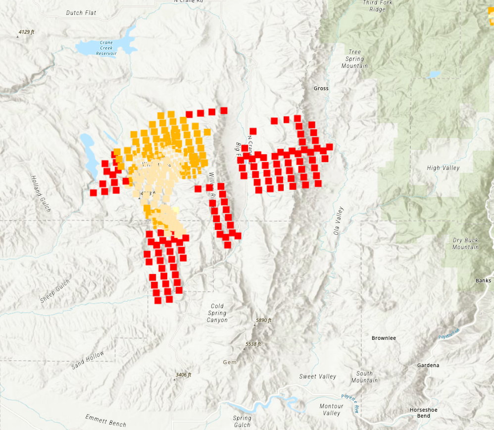 Few Idaho range fires are turned over to an Incident Management team, as they can usually be handled within 2-3 days by local fire crews with assistance from regional air resources where needed. Given the activity today and the evacuation notices in the area, I would not be surprised if this gets an order for an Incident Management Team. That said, I don't have enough ground truth information to say if this fire is catchable at Ola before crossing Chief Eagle Eye Creek. It may lose enough steam in the wee hours of the night that it doesn't reach it, or such that a firing operation and dozer work can secure that road north of Ola. Or... it could burn all night. This will be the first fire I look at Wednesday morning – I'll post updates on my Threads account as soon as I have anything concrete.