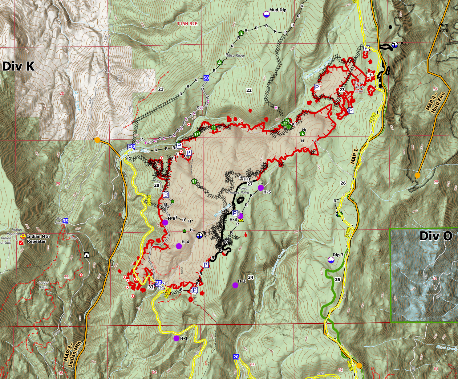 - Northern Flank: The fire is advancing into Kinney Creek, remaining half a mile from Horse Mountain Lookout. Crews are working to establish firelines up to the lookout.