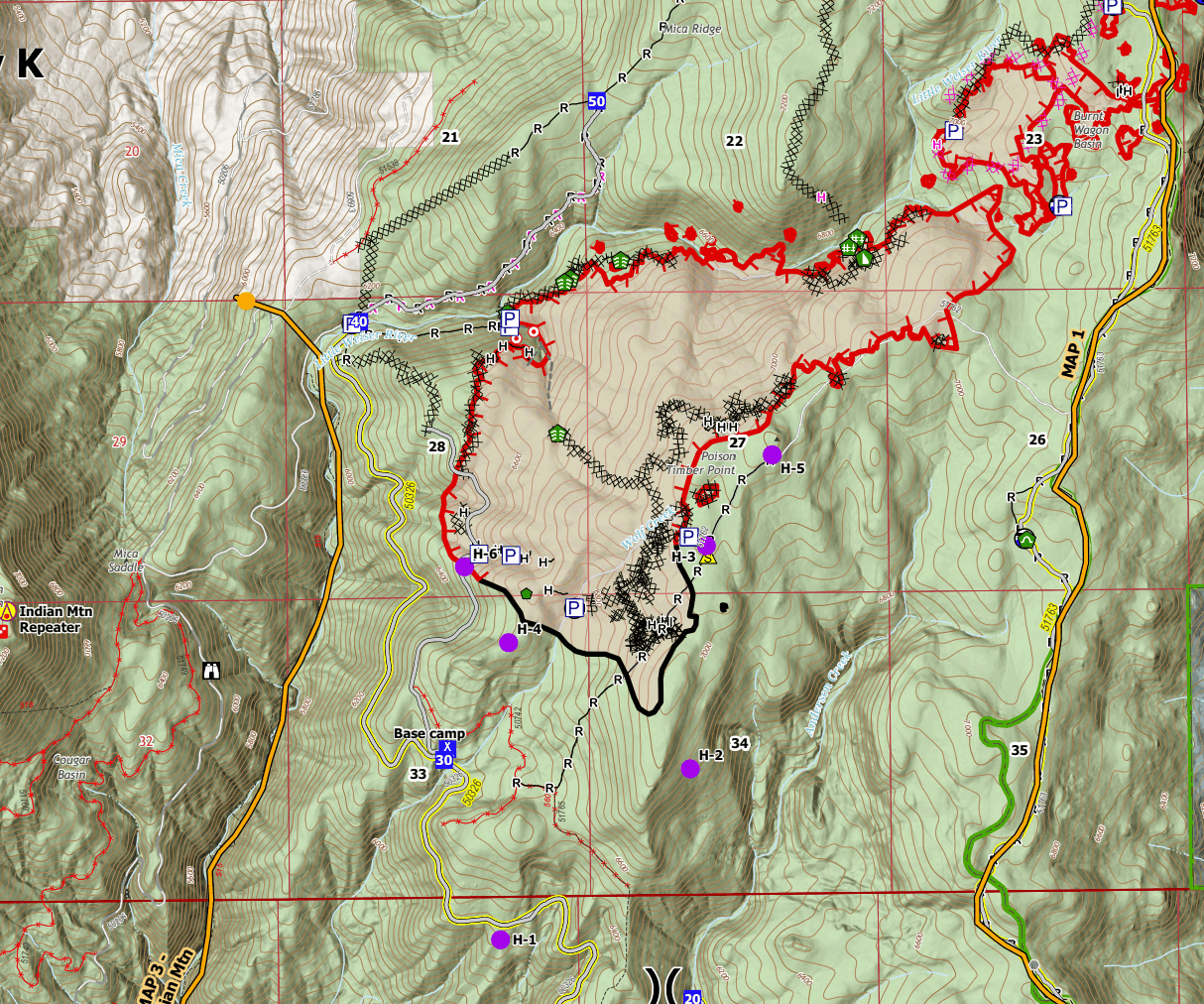 The main concern is growth toward the northeast, and from watching it the last day or so and looking at the ops map, IR map, and all that, it looks like they've got that threat fairly well mitigated. Any fire movement on the east side of the ridge threatens residents along the lake and up towards Tamarack. They've fully contained the previous spot fires on the east side. I'm also seeing some good contingency work on Mica Ridge.
