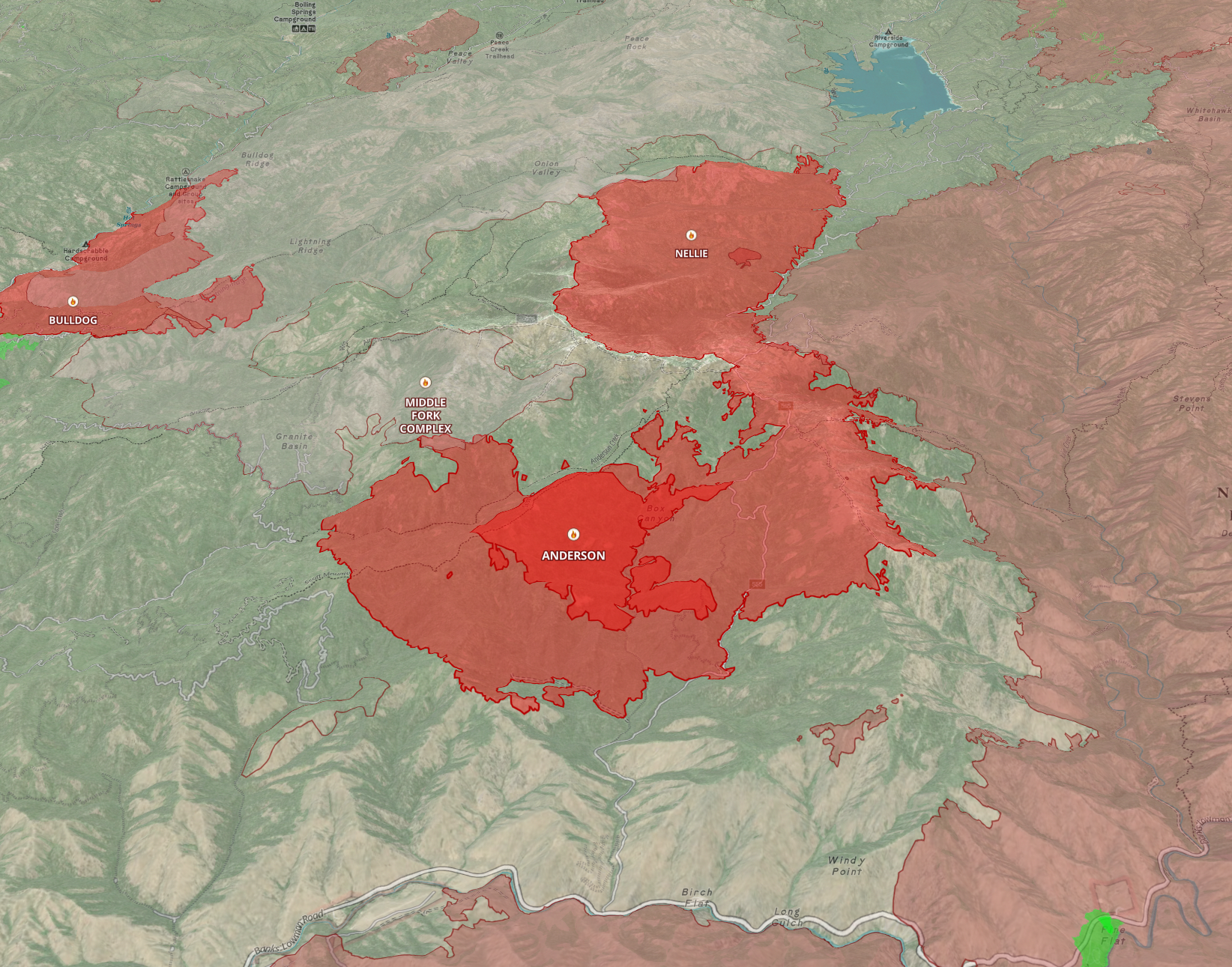 Yesterday was a very active day on the fire. The north flank made quite a run-up Mount Zumwalt. The fire was slowed by the 2003 Canyon Creek burn scar and the 2018 Wapiti fire area. However, the fire behavior was extreme, and there was a long-range spot fire that I measured at about 1.5 miles ahead of the main fire.