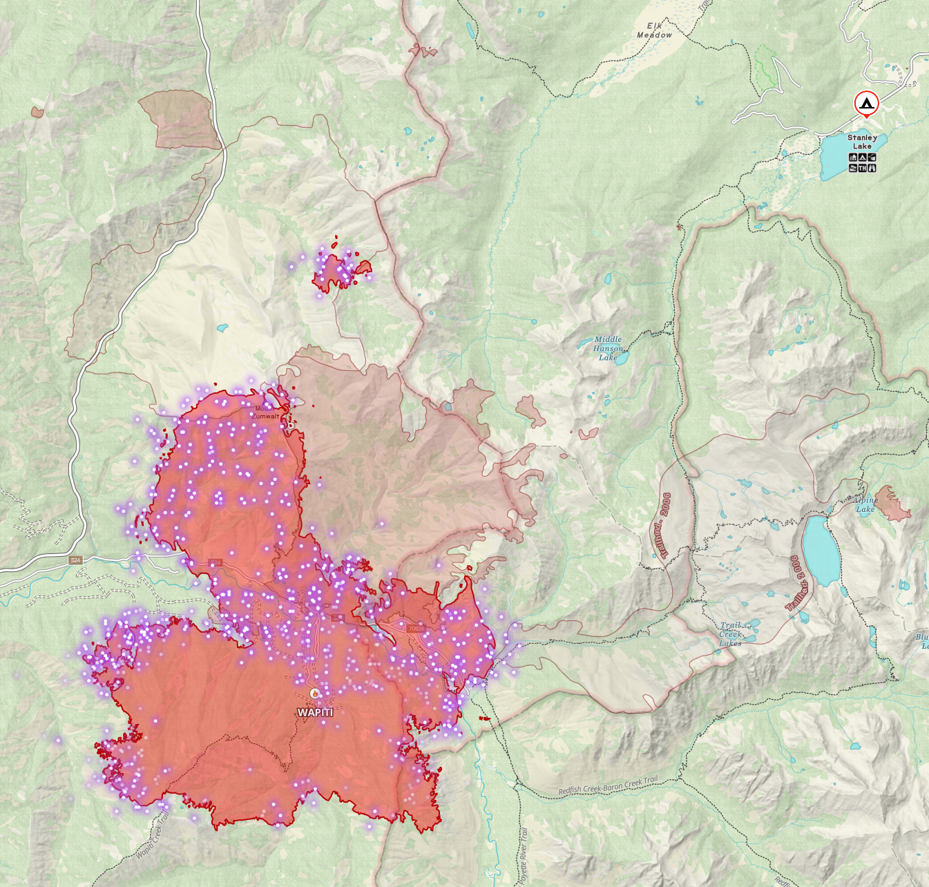 First, if you hadn't seen the news, six cabins in the Wapiti Summer Homes area were lost to the fire, which managed to cross the valley and establish itself on the north side of the river.