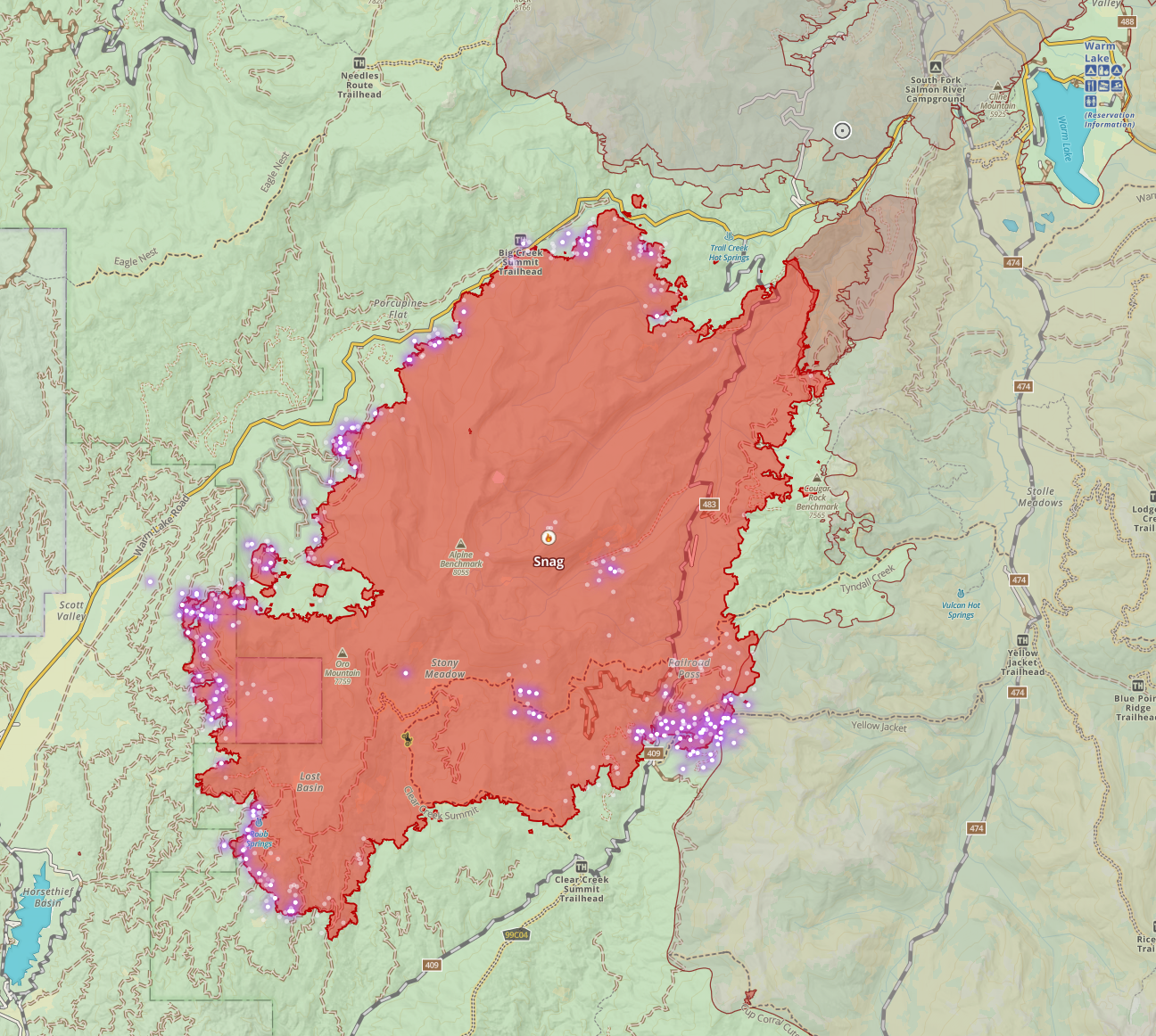 Looking first at the East and North-eastern side, I said in my previous updates that if the fire reached the Warm Lake area, it'd be lower intensity, and we'd see this end handled with a night or two of firing operations. That's still true, but at this point, I don't see the fire progressing toward Warm Lake at all. There's a scenario or two where it could, but I find it increasingly unlikely. The fire is not burning into the scars from the 2007 Monumental, 2007 North Fork or 2015 Cougar fires. I'm seeing less heat on that end every time I look.