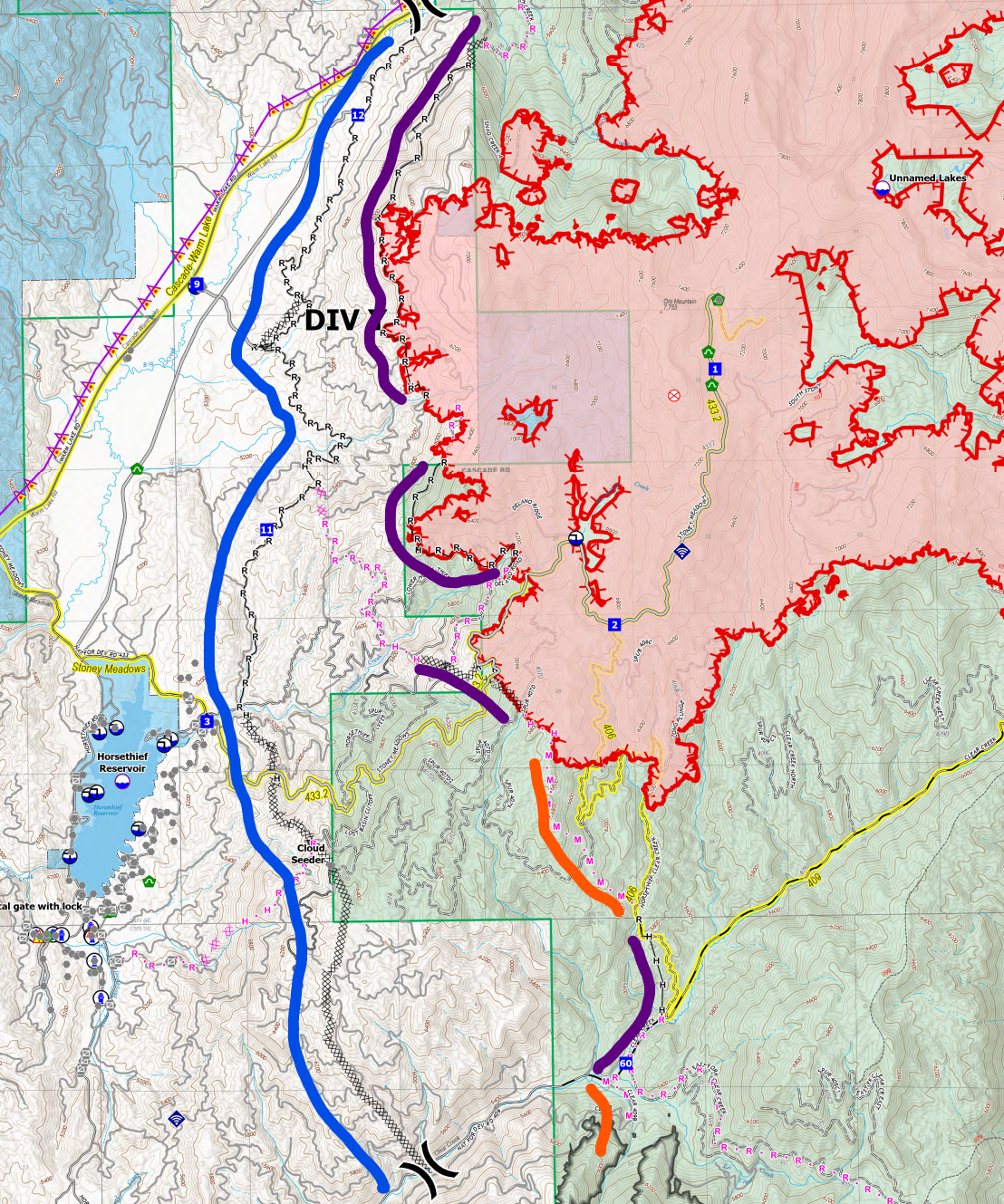 The map above is the official operations map, with a few highlights I added. Next to the blue highlight, you'll see the contingency line, which has been in place for about a week or so. This line, a mix of a dozer line and an old road has been improved and prepped as an indirect fuel break to protect Horsethief. I'm very confident in that contingency line's ability to protect Horsefhief. If the fire gets near the line, a burnout will reinforce the line further.