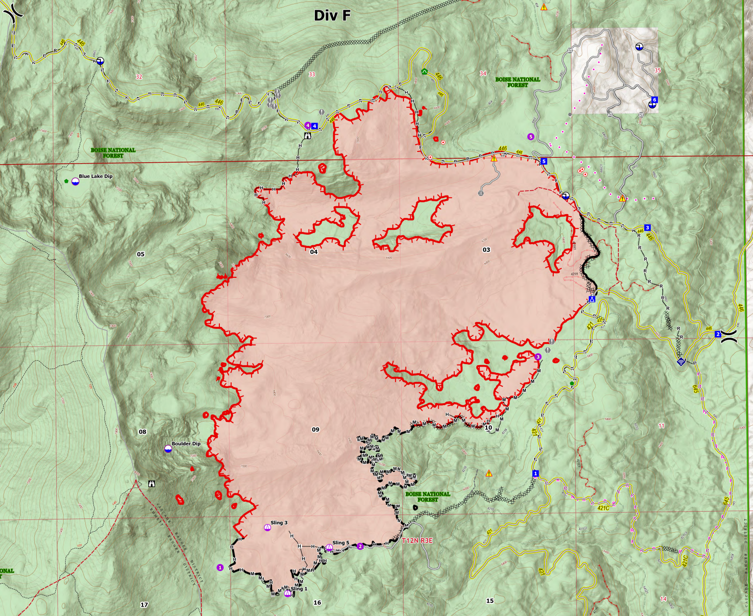 It appears the large burnouts on the Northeast and East sides of the fire have wrapped up. The fire shows 26% contained, but given the amount of line around this fire and natural barriers, they've pretty much got this fire pinned in. The fire may burn a bit more in the head of Fawn Creek, but significant movement or movement in any other direction is unlikely. I'd expect a significant increase in containment over the next few days.