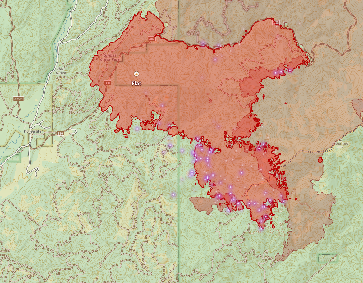 I'm feeling pretty good about the work done on the Flat Fire at this point. I think the threat to Pioneerville is extremely low. The fire's West end shows little or no heat and growing containment there with a mix of dozer lines and logging roads layered up to prevent westward movement. On the north side, we're bumped up to old burn scars and not seeing any progression into them. On the southeast side, where I've been most worried, there's a dozer line extending almost to the old burn. There is still risk on this flank, especially with a red flag warning in place today, but I'm generally optimistic they'll catch this end without much further movement South or East. Scoopers are supporting fire crews in this area today.