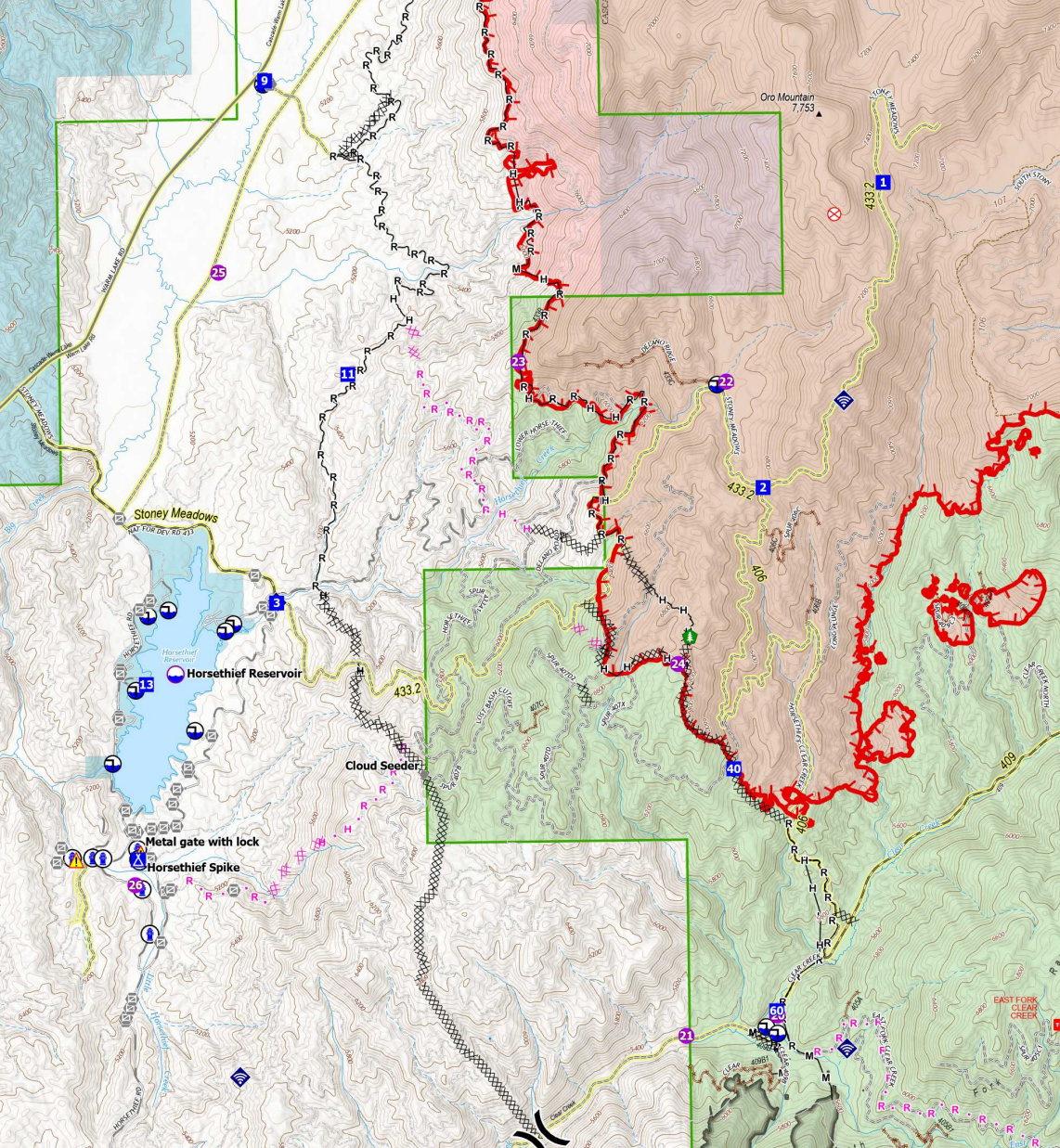 Starting on the Southwest side of the fire near Horsethief, the fire has been held at the primary line aside from one slop over they had almost a week ago. They've got that area pretty much wrapped in a dozer line at this point; I'm not too worried about it. I would be very surprised if this fire crosses this primary containment line with current and near-term predicted conditions. And, of course, they have a contingency line closer to the reservoir.