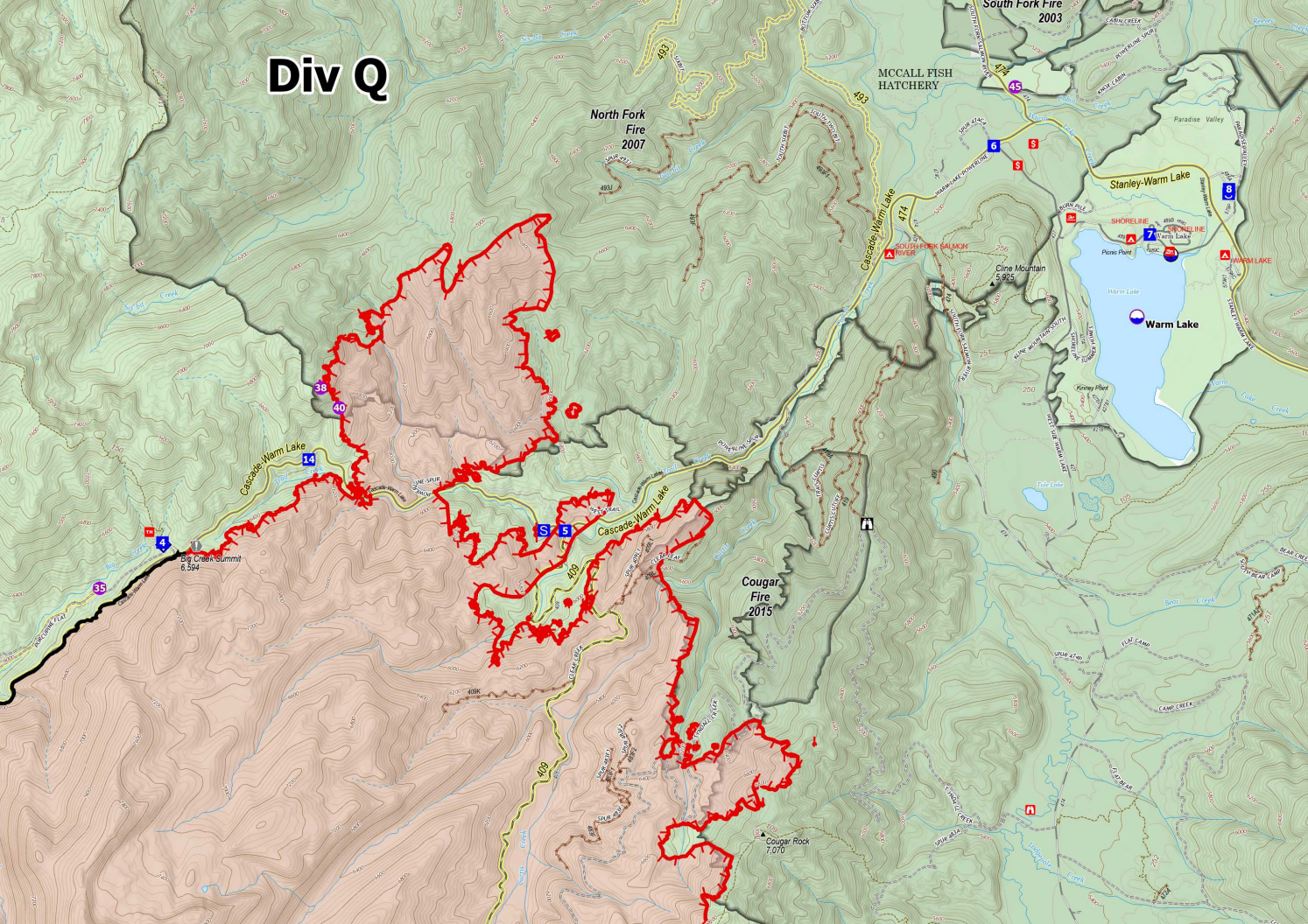 As I said before, most of the activity has been in the Northeast corner of the fire, especially in an area that crossed the Warm Lake Road. I'm not sure how much growth we'll see in that area to the north of the road, it quickly entered the 2007 Monumental Fire Scar. It's in an area of the Monumental that was less scorched earth than others, so there is fuel to burn, but significantly less than outside that burn scar. There are also a few islands and pockets of fuel that weren't burned in the Monumental. I think there is some threat of movement toward Warm Lake from this area, but I would say the risk of it reaching the Warm Lake area is relatively low. And, if it did, there are enough anchor points that I would think a burnout would successfully stop the fire before any structures or resources in the area were at significant risk.