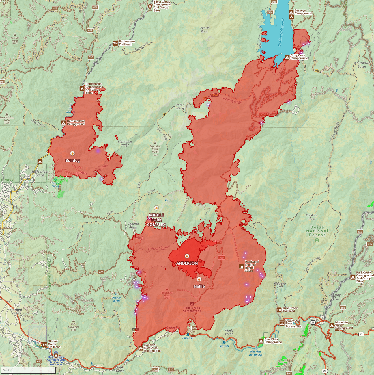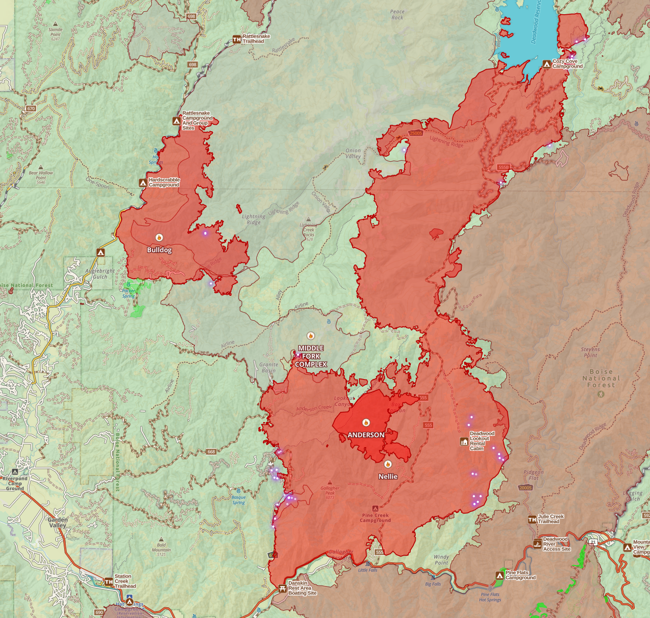 There are three main areas of concern on this fire: the first is at Deadwood Reservoir, the second is on the southeast side near Loman, and the third is on the southwest side near Garden Valley. Pretty much everything else is pinned in due to historical fire activity.