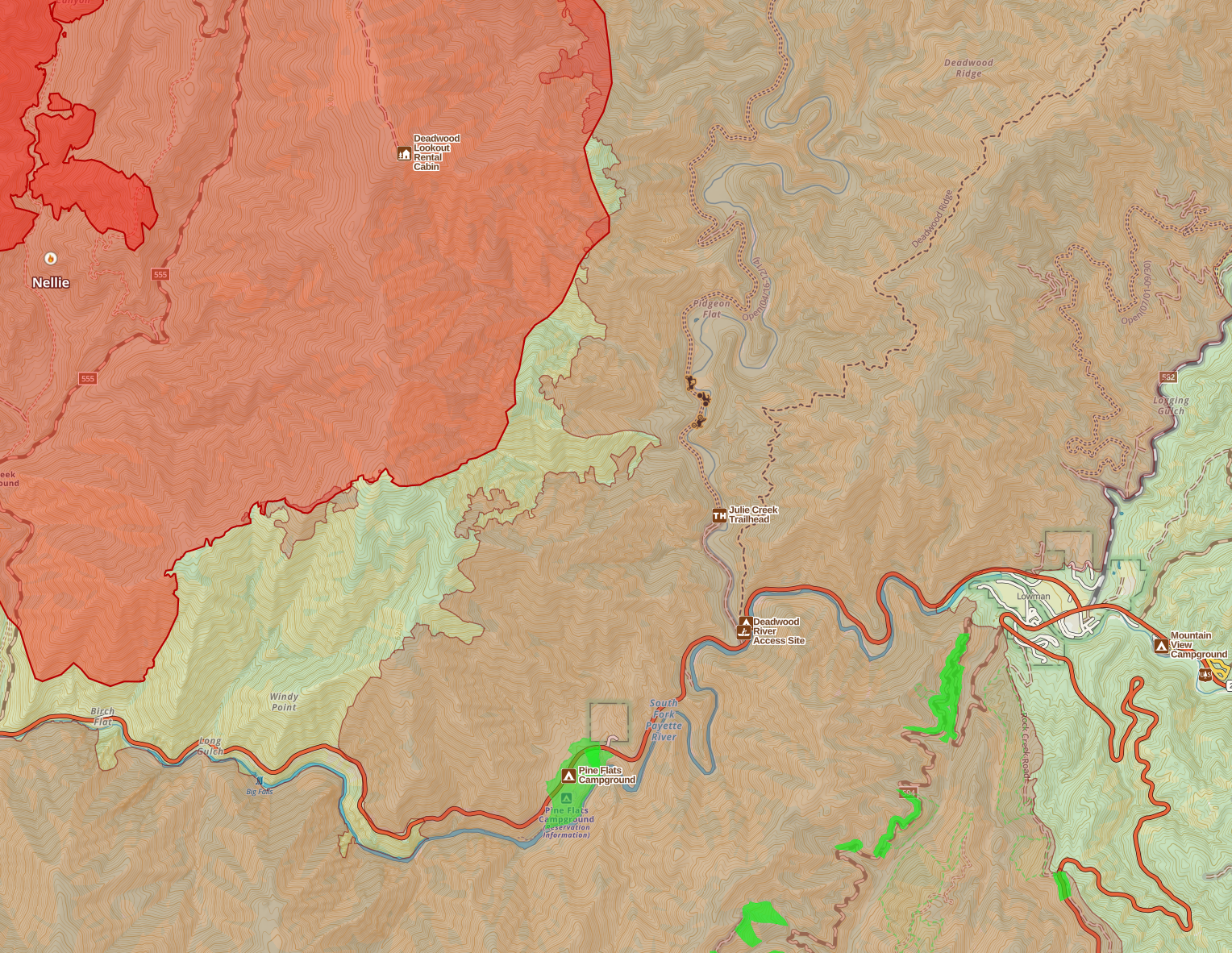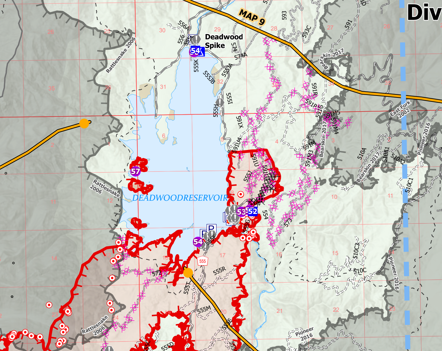 Starting at the north end, around Deadwood crews are now trying to prevent northern progression of the fire beyond deadwood. They're using some old roads and dozer work to tie a line between the lake and the 2016 Pioneer Scar. That's a pretty small chunk of forest they need to wall off between the lake and the old burn, I'm fairly optimistic it'll be a success.