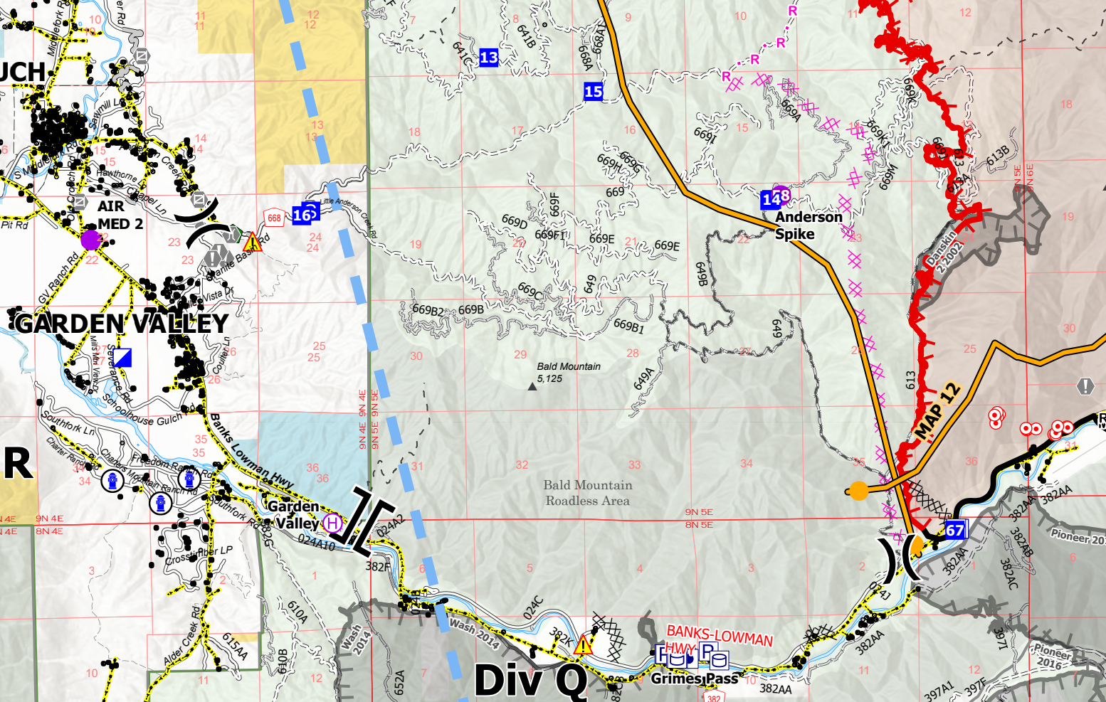 From what I see on the operations map and from what I see in updates, I think they'll have this side butted up pretty quickly. At the road, the fire is at a Management Action Point that would likely spur evacuation "READY" status for much of Garden Valley. But I'm inclined to believe that won't happen at this point. While structure protection assessment and planning is ongoing in Garden Valley, I don't currently think the fire will get established on the west side of that line. As I understand it, the proposed dozer line (pink-ish XX marked line) is largely cut and fire crews will be working to improve it and at some point soon do burnouts to tie it into the fire.
