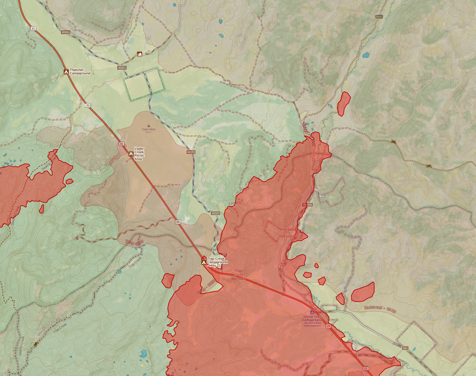 I'm not concerned about the Snag Fire impacting Horsethief or Warm Lake at this point. The threat could change if we get a few hot dry days and high winds and have a string of bad luck--there's a reason you don't call fireline contained until it meets a high bar. But I'm seeing a lot of lines that, while it doesn't meet that contained definition, it really should hold at this point.