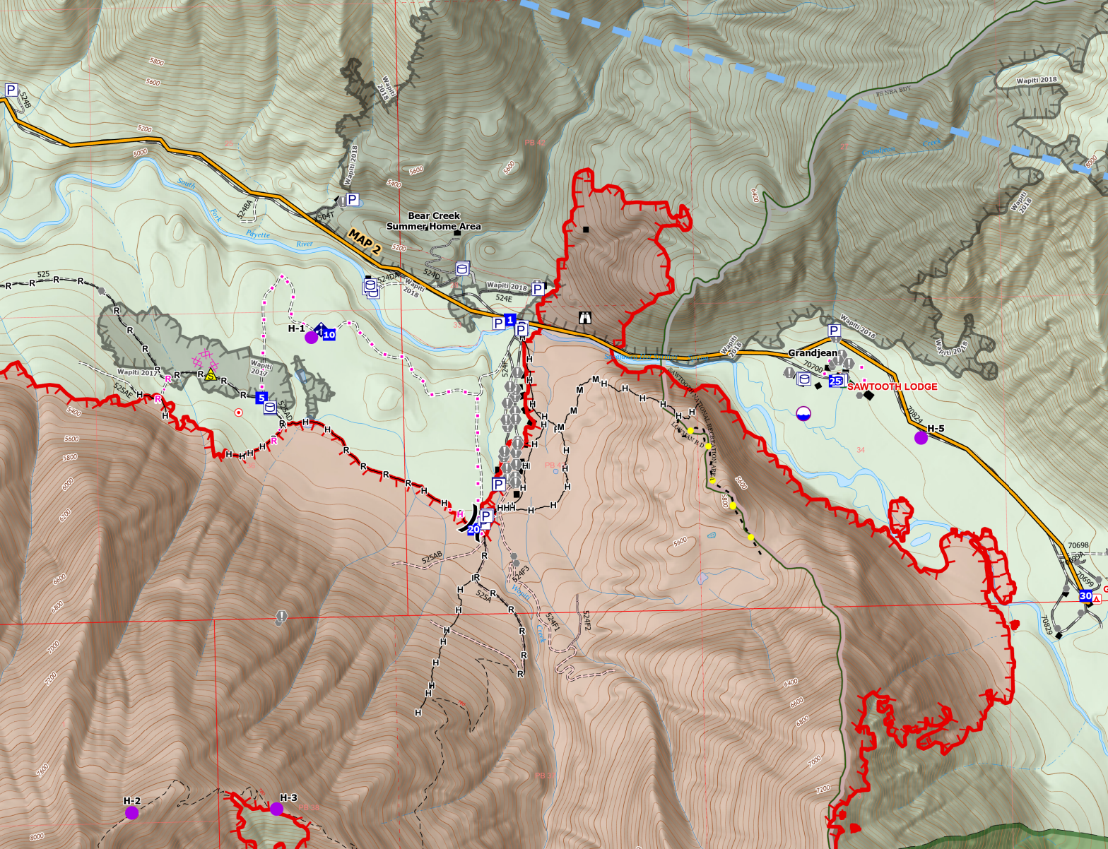 I'm going to show the area where the fire impacted the structures, but let me just reiterate: Just because a structure is within the fire perimeter doesn't mean it burned. Most fires don't burn everything in their path, and fire crews had structure protection in place; the ONLY way to know its true impact is through direct assessment, which will happen as soon as fire crews deem it safe to re-enter the area for assessment. All we know is that some structures were impacted, but not what structures or how badly. I have just seen video of a fire impacting a cabin in the area, and it certainly is concerning, but ultimatly it's inconclusive as the camera was on a tree that burned, not the cabin. In good news, I've not heard of any significant firefighter injuries related to this event.