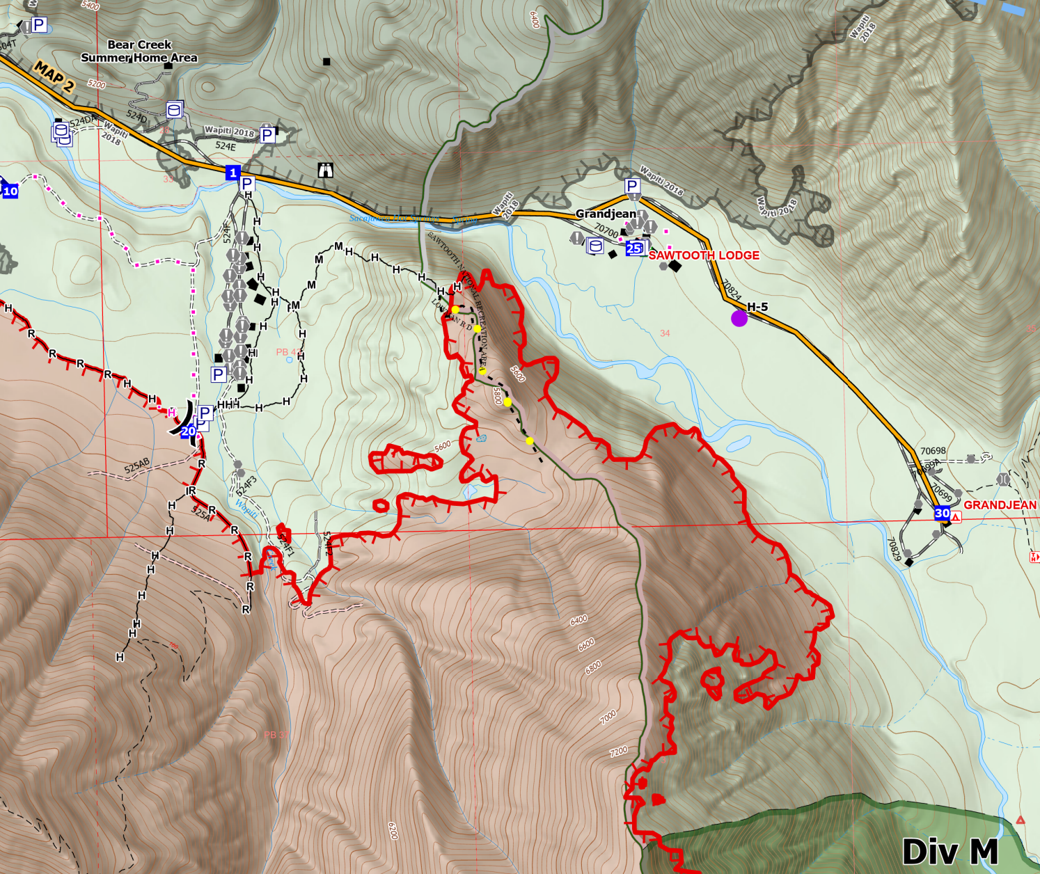The Wapiti Fire has been hanging out on the ridge above Grandjean, rather unmotivated to leave the ridge. Most work done on the Wapiti has been to point/structure protection to protect the homes, lodge, and other values in the grandjean area. This generally includes extensive sprinkler systems to keep the area wet and humidities higher, fuel reduction, creating lines between the fire and the structures, creating black along those lines, and other protection methods.