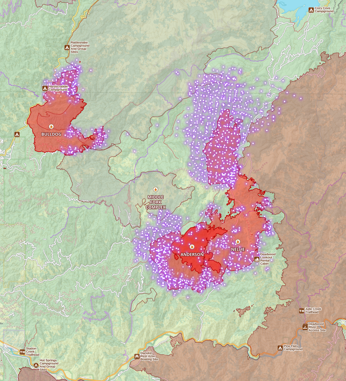 Yesterday, the Nellie Fire had a significant run to the north and a smaller push to the West. Before we dive in, I want to call out a few notes about this fire. First, this fire is currently in monitoring status, which means crews are not actively fighting the fire. However, they are doing point protection to protect resources in the area. In this case, that means Deadwood Lookout, Scott Mountain Lookout, and a communications tower. They are evaluating potential impacts and deploying additional point protection as needed. Second, given how active this fire was and how much of a column it was putting up (see header image at the top of this article), the Satellite-based fire detection maps are going to be less accurate, especially downwind. This is because the satellite sensors can't reliably determine the difference between fire at ground level vs intense heat in a column above and downwind of a fire. What you see on the various fire "apps" and the dots in my map below may not reflect the actual heat perimeter.